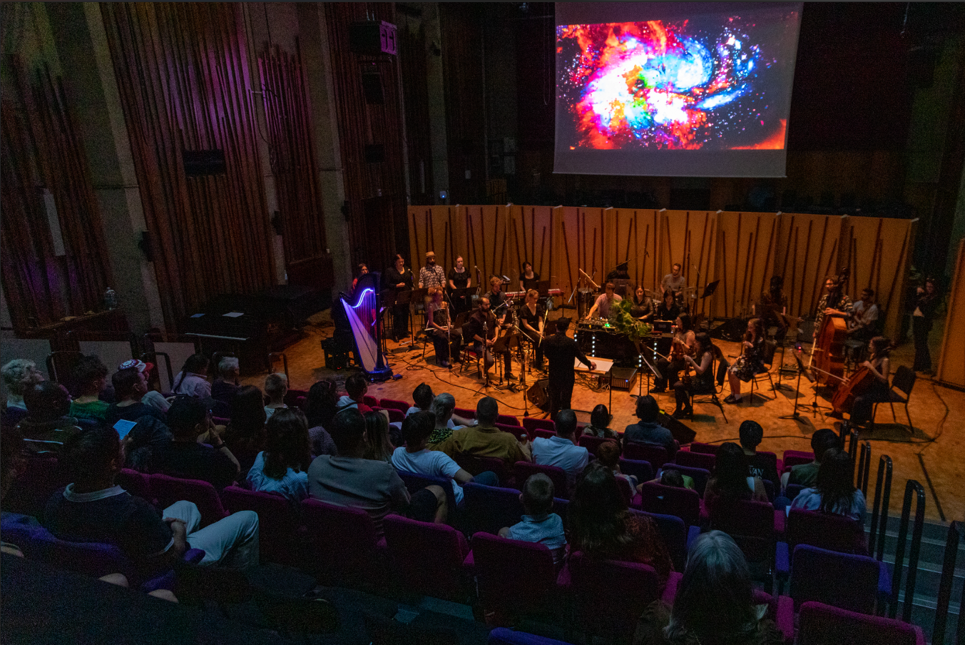 The Electric Earth Orchestra’s third concert presented KÓSMOS, an immersive journey of orchestral instruments, electronics, and plant sonification. With visuals by Nibera (Slovenia) and stage design by Pete Wallace, the performance transformed Silk Street Hall into a living, multi-sensory environment — where signals from plants, musicians, and machines merged into one sonic landscape.